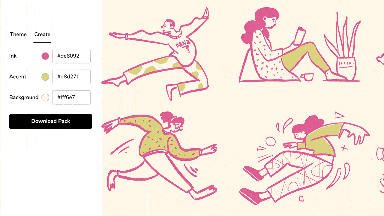 除了首页的红黑默认配色效果,网站还提供了「Generator」发生器模块,内置了其他共6种默认配色主题以及自定义画笔颜色、强调色和背景色来个性化设置资源插画配色效果的「Create」创造功能。