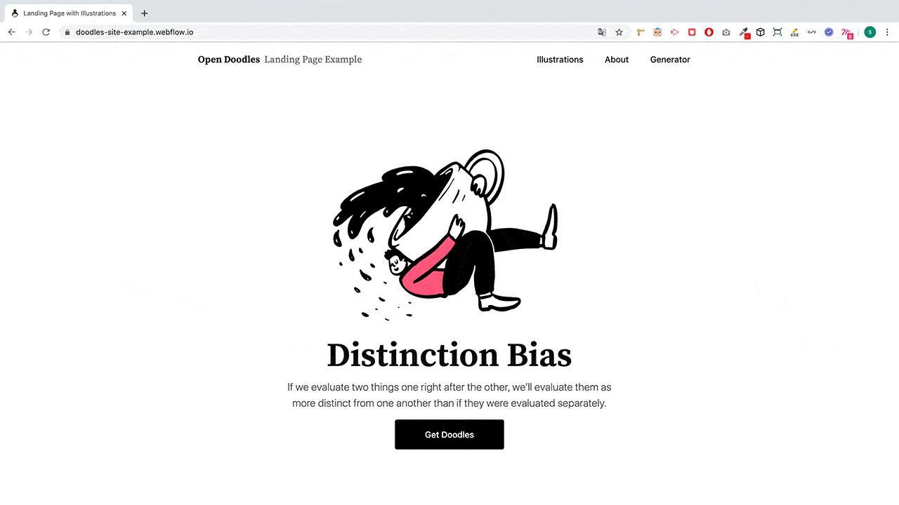 在「Example」范例网站示例页面 Pablo Stanley 运用 Open Doodles 网站的插画素材为我们创建了示例网站效果,大家可以参考这个示例来将 Open Doodles 网站的插画素材运用到自己的项目中。