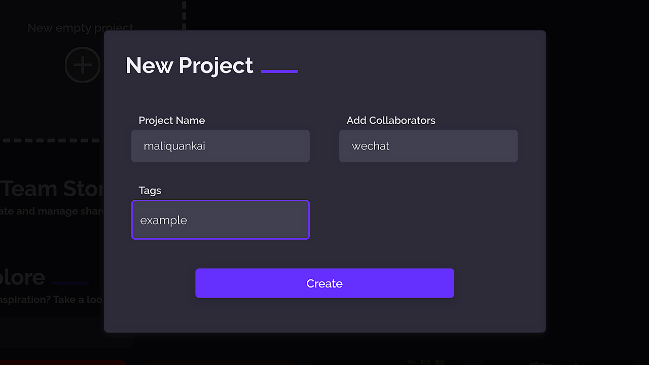 点击「New empty project」创建新的空项目,填写项目名称、添加合作者、标签等信息,点击「Create」新项目创建完成。