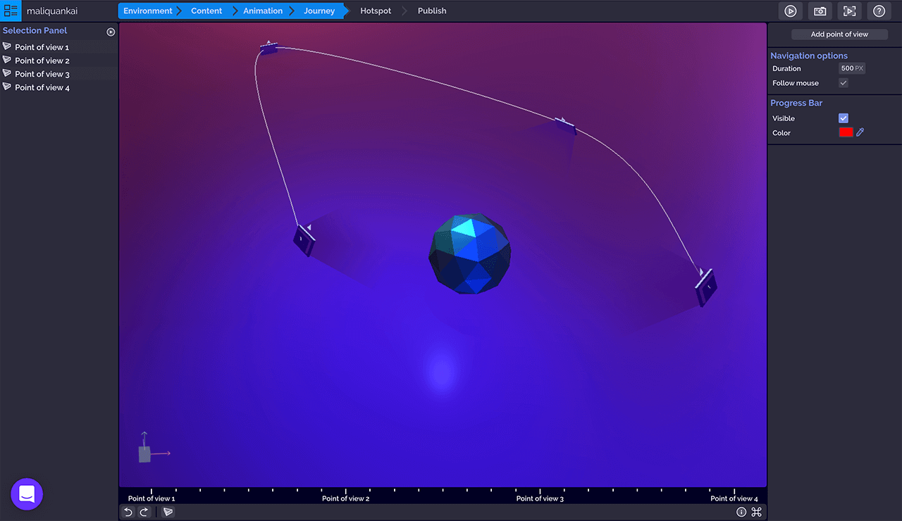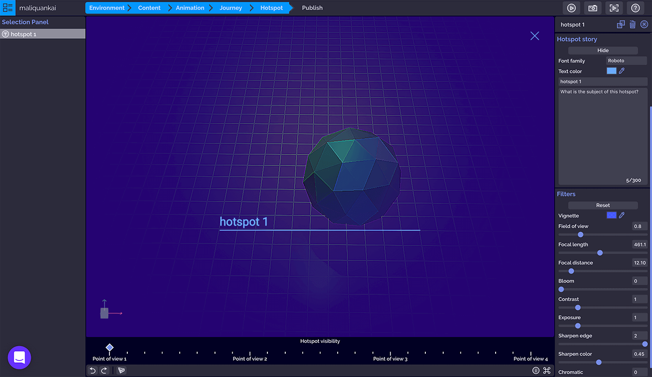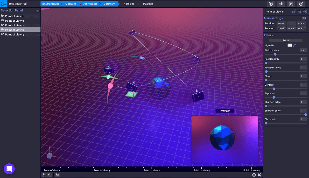 点击「Add point of view」添加观点按钮创建新的观点,左侧选择面板列表显示所有观点,拖动观点顺序可以改变相机的旅程轨迹,选中的观点和组件一样,在中间的3D画布上会显示选择器用以改变观点的位置、旋转观点视图,同时在3D画布右下角「Preview」预览窗口实时监控相机画面。右侧操作面板可以对观点的位置、旋转做主要设定,也可以通过筛选器调整画面的视野焦点、对比和曝光、锐化边缘和颜色、色差等。