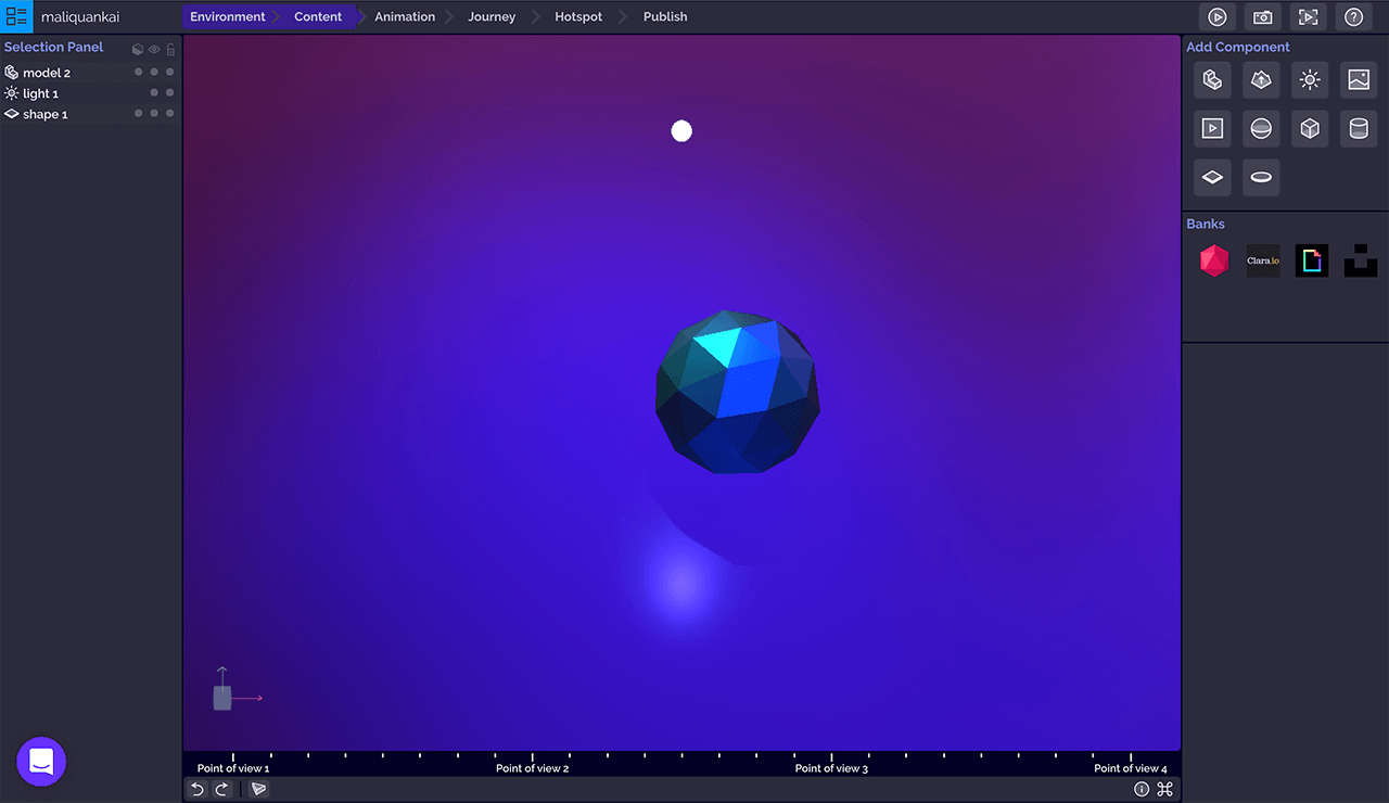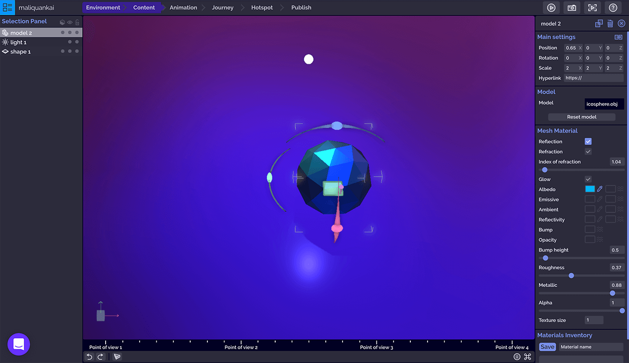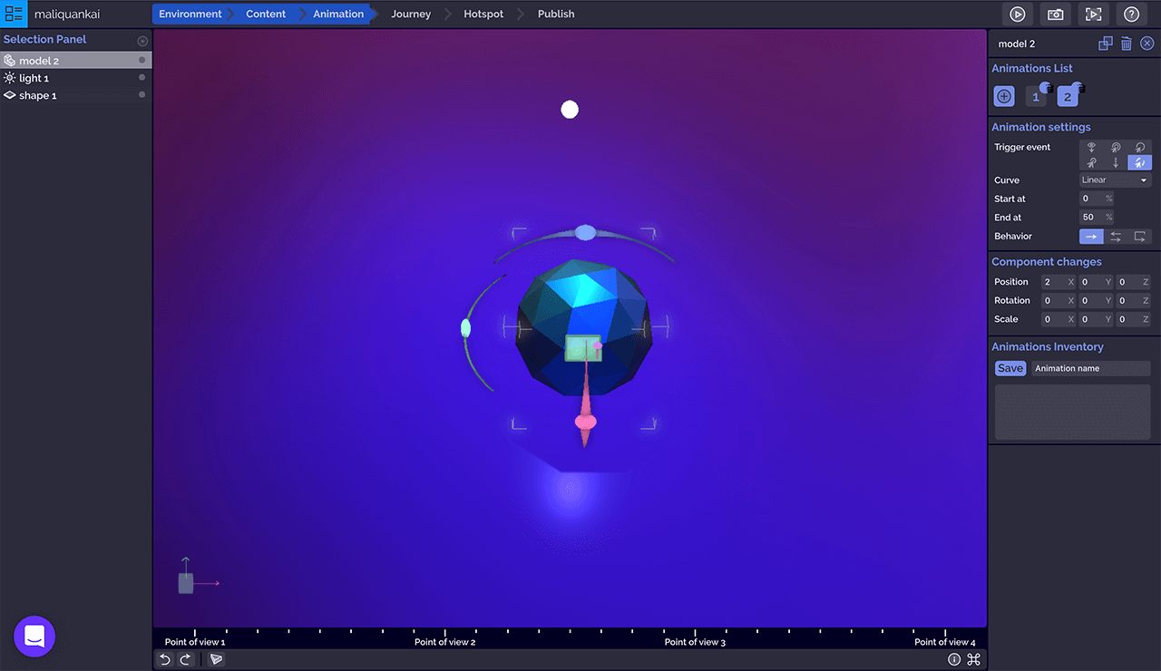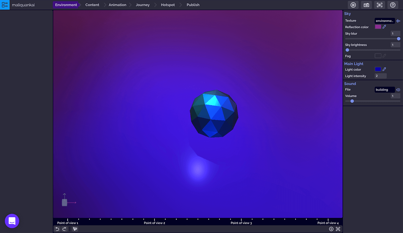 点击「Add point of view」添加观点按钮创建新的观点,左侧选择面板列表显示所有观点,拖动观点顺序可以改变相机的旅程轨迹,选中的观点和组件一样,在中间的3D画布上会显示选择器用以改变观点的位置、旋转观点视图,同时在3D画布右下角「Preview」预览窗口实时监控相机画面。右侧操作面板可以对观点的位置、旋转做主要设定,也可以通过筛选器调整画面的视野焦点、对比和曝光、锐化边缘和颜色、色差等。