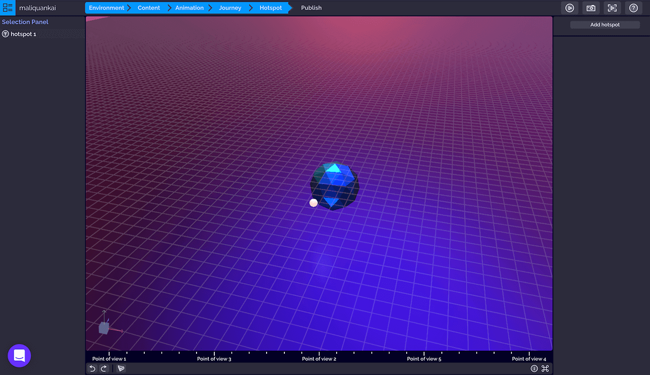 第五步热点标签「Hotspot」页面,一个热点就是一个兴趣点,是在动画中添加和观众互动式的内容,点击「Add hotspot」新增热点按钮即可添加热点。