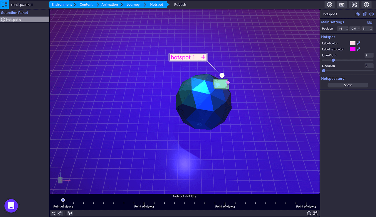 一个热点由一个球和一个标签组成,添加完成的热点就放置在3D场景中,我们可以通过右侧操作面板调整热点位置、标签及文字颜色等参数。底部滚动线代表整个动画,这个时间轴不是基于时间而是滚动,也就是前面我们添加的旅程标签,我们可以在滚动线更改热点的位置。