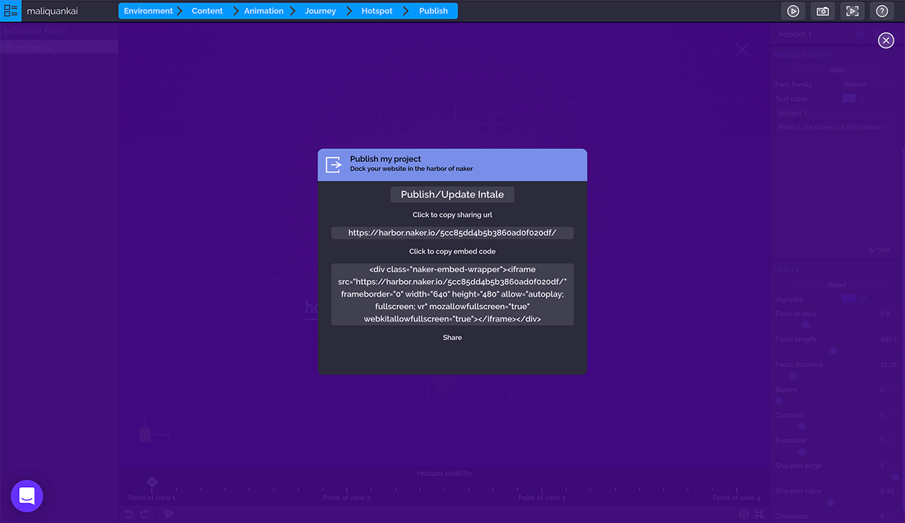 调整好热点之后我们需要为热点添加故事,点击右侧操作面板「Hotspot story」中的「Show」按钮,我们为热点创建一个专属的展示页面,文字及画面设置通过调整右侧操作面板「Hotspot story」和筛选器「Filters」中的参数来完成。