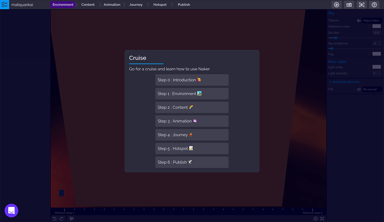 第一步创建环境「Environment」页面,右侧操作面板提供调整天空-3D背景、灯光、背景声音等参数。