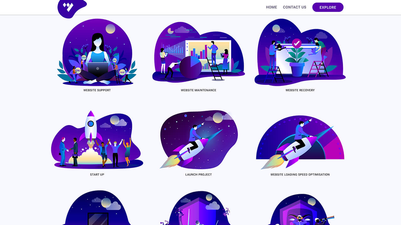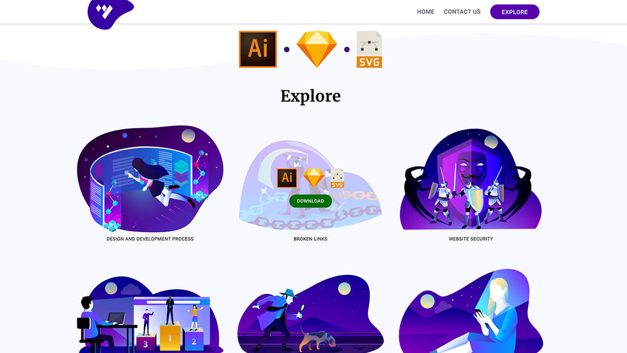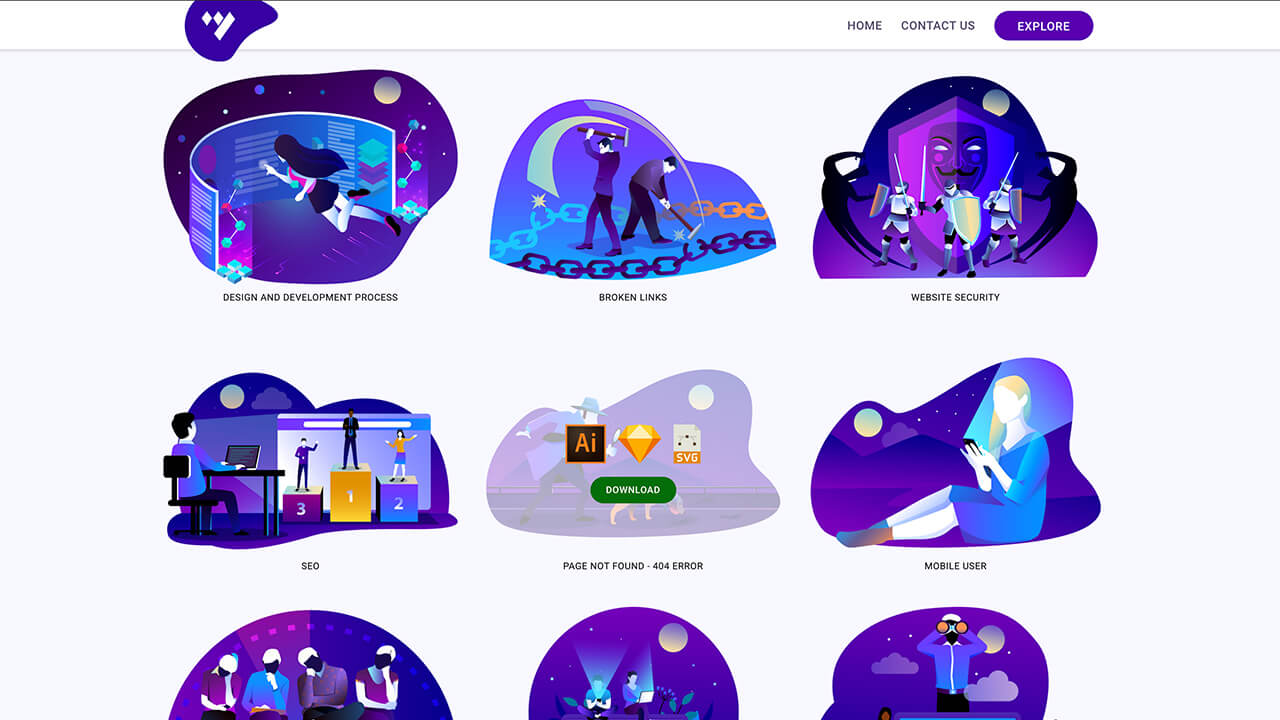 我们也可以点击EXPLORE,更方面我们浏览全部插画素材,根据自己的需求下载对应的矢量插画。