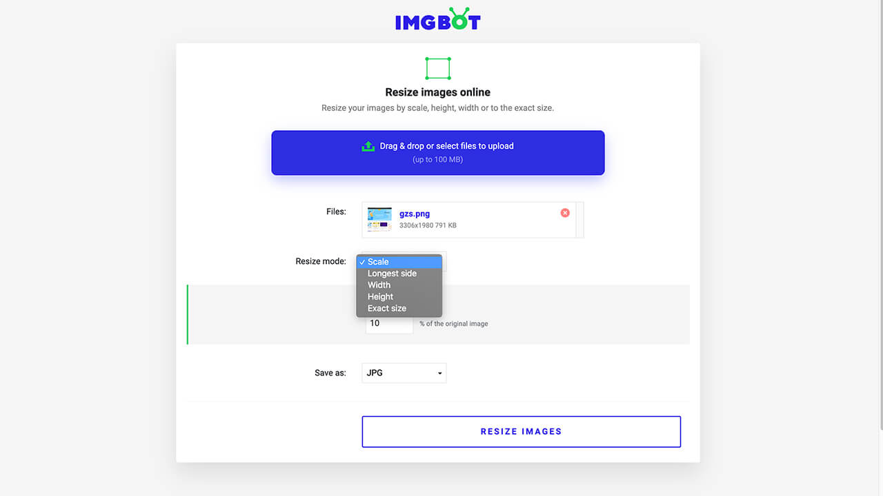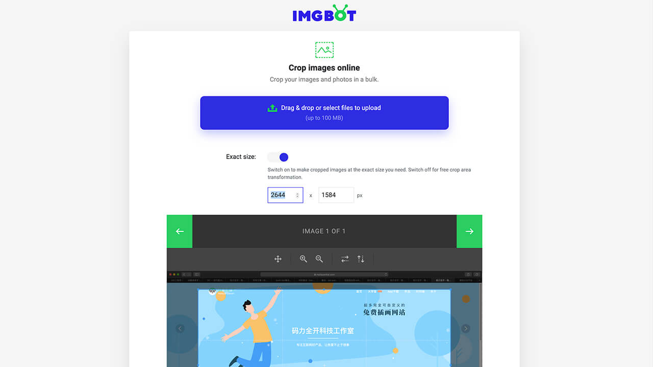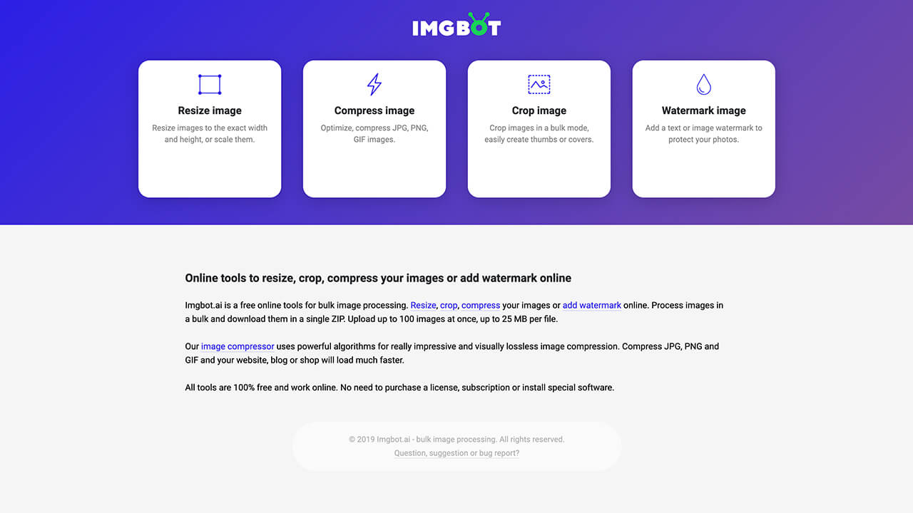 今天发现了另外一个图片压缩工具IMGBOT,它不止有压缩功能还有调整图片大小、裁切图片和图片加水印功能,而且支持批量编辑,一次最多可以上传100张图片,每个文件的大小不能超过25MB。