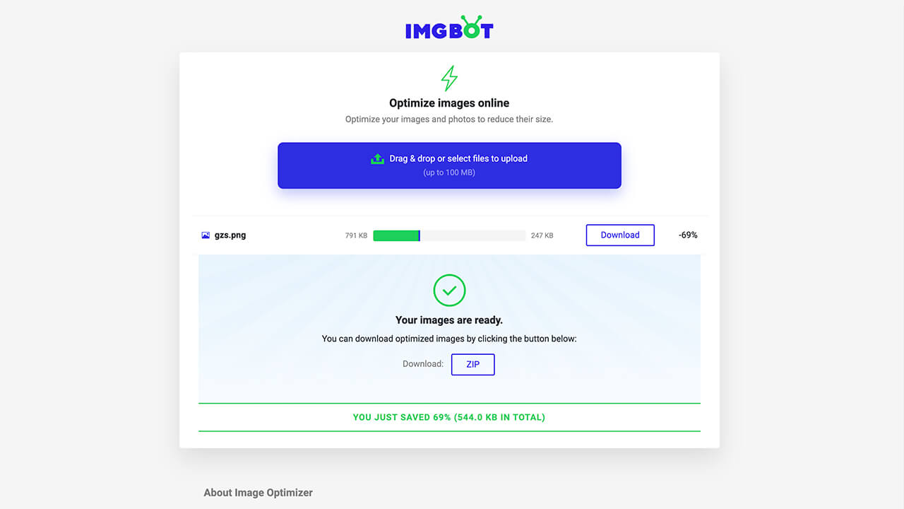 Imgbot.ai是用于批量图像处理的免费在线工具,它的图像压缩器使用强大的算法来实现令人印象深刻且视觉上无损的图像压缩,支持 PNG、JPG 和 GIF 三种常见图片格式。