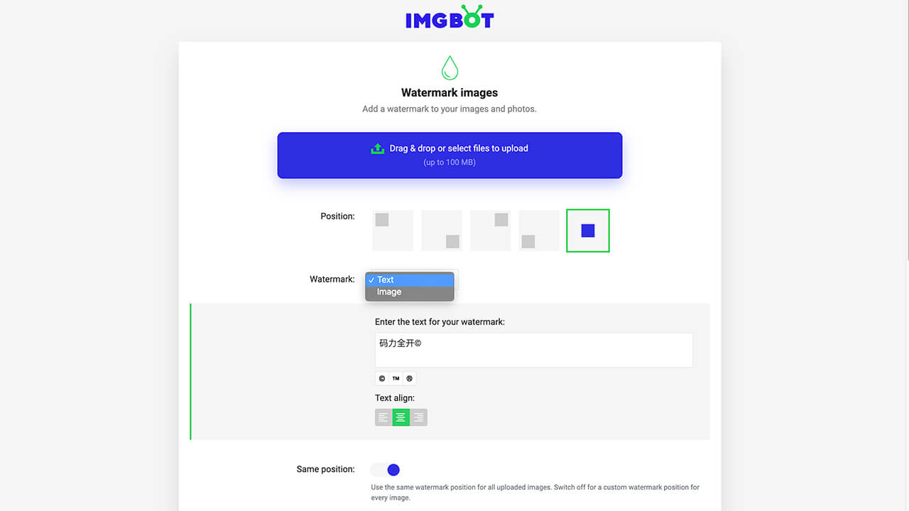 最后一个是图片水印功能,选择完图片我们可以选择水印的位置,这里提供了五种分别是左上、右下、右上、左下、居中,同时还可以选择水印是文本还是图片形式,输入水印的文字或者添加一下水印图片即可完成。