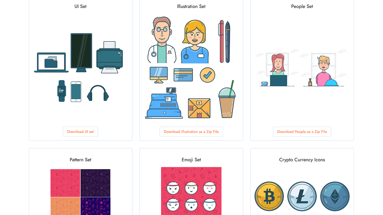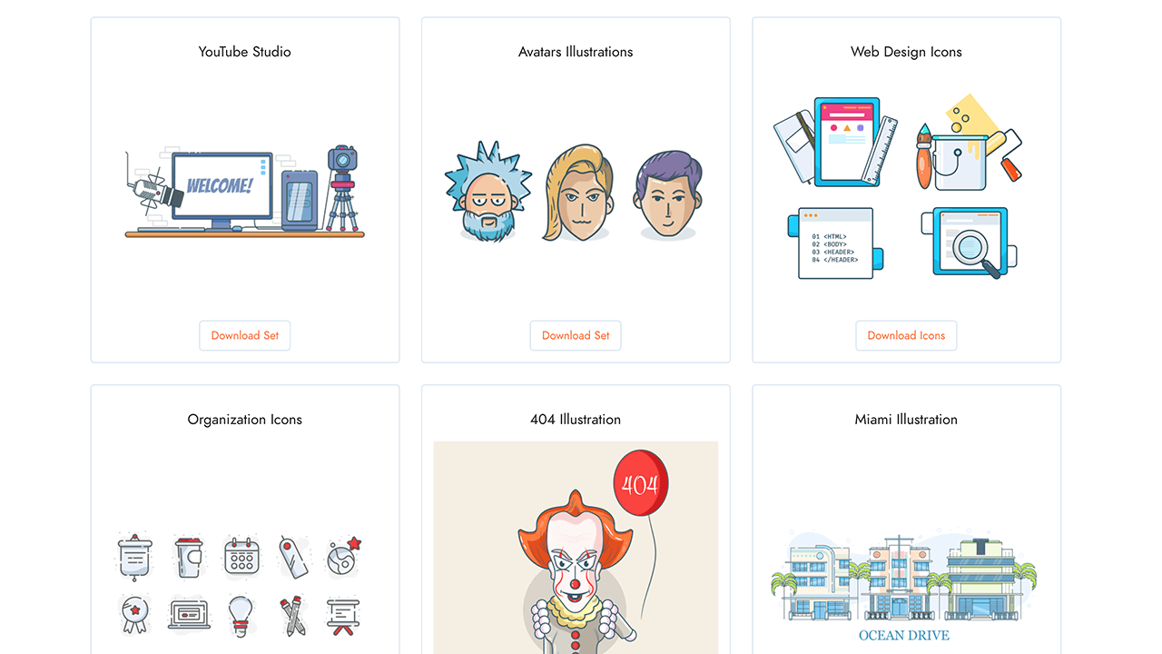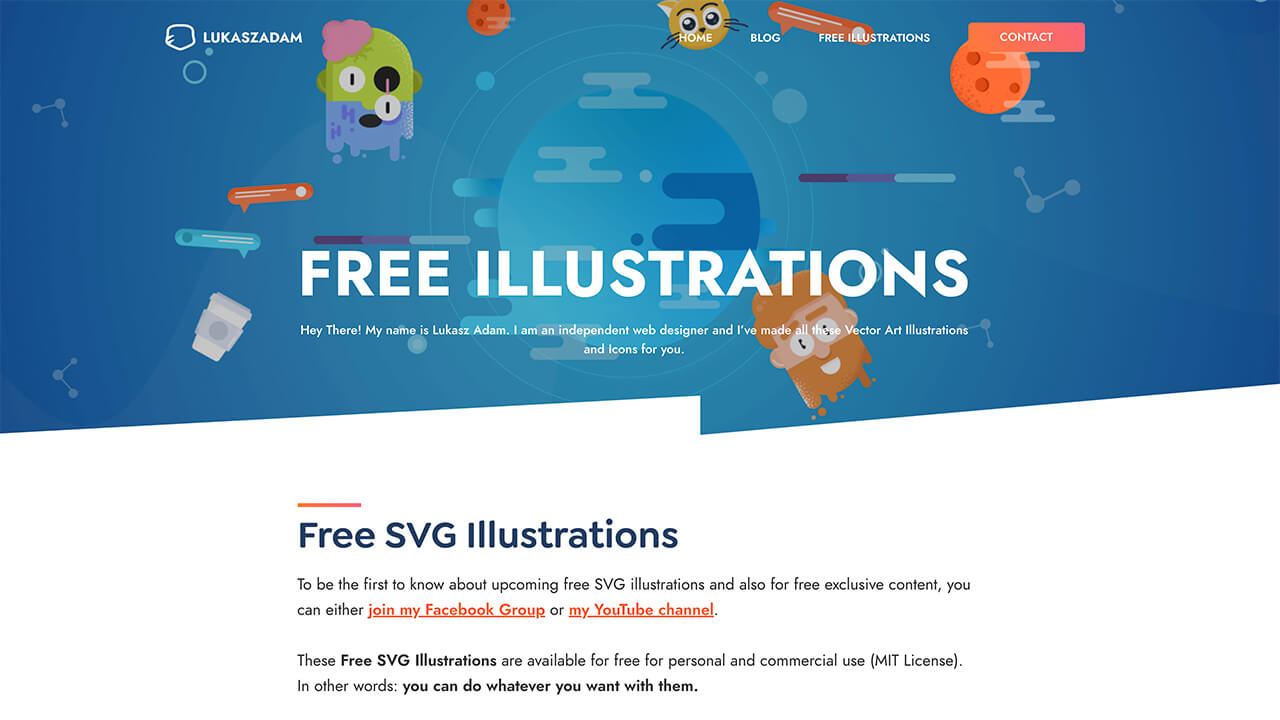 打开网站,就可以看到这位独立网页设计师的免费插画和图标,你可以关注他的FaceBook和YouTube频道第一时间了解即将发布的SVG插画以及免费的独家内容。