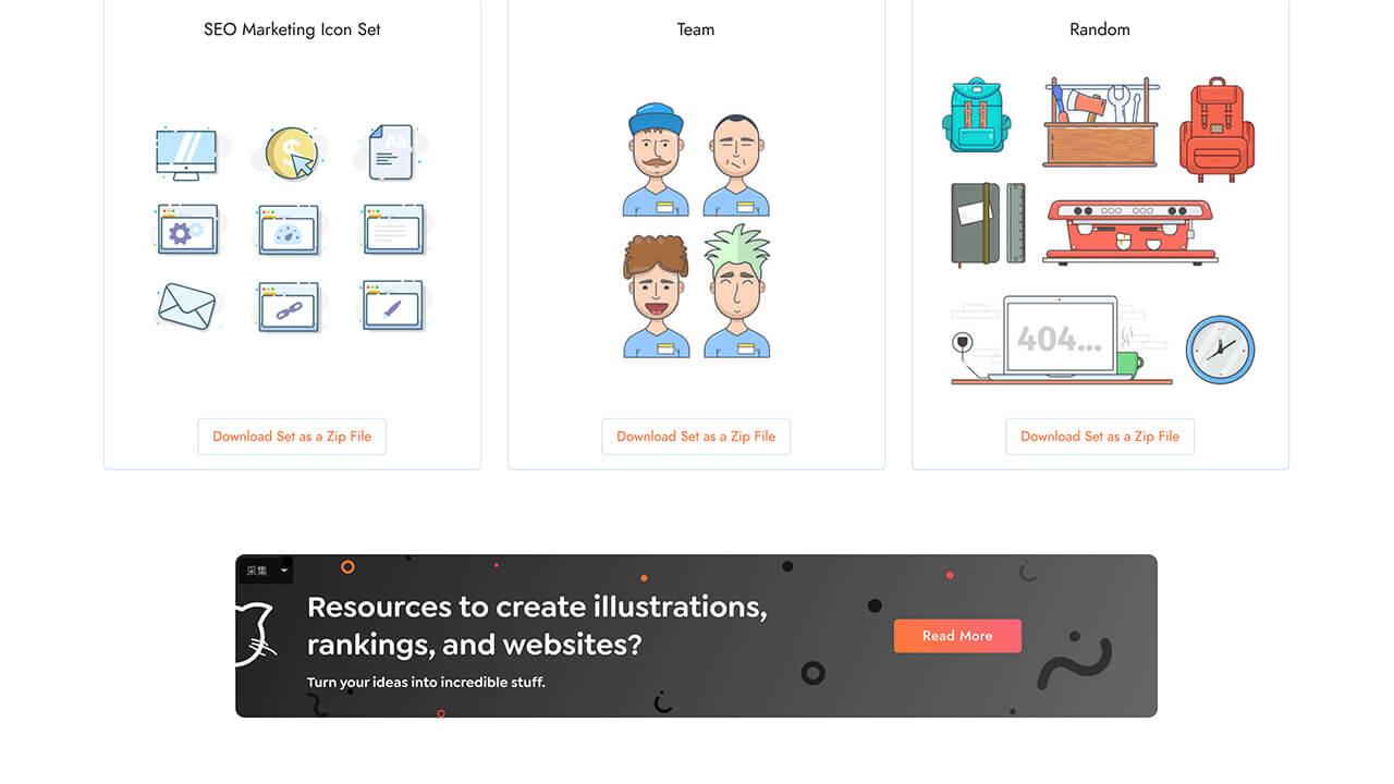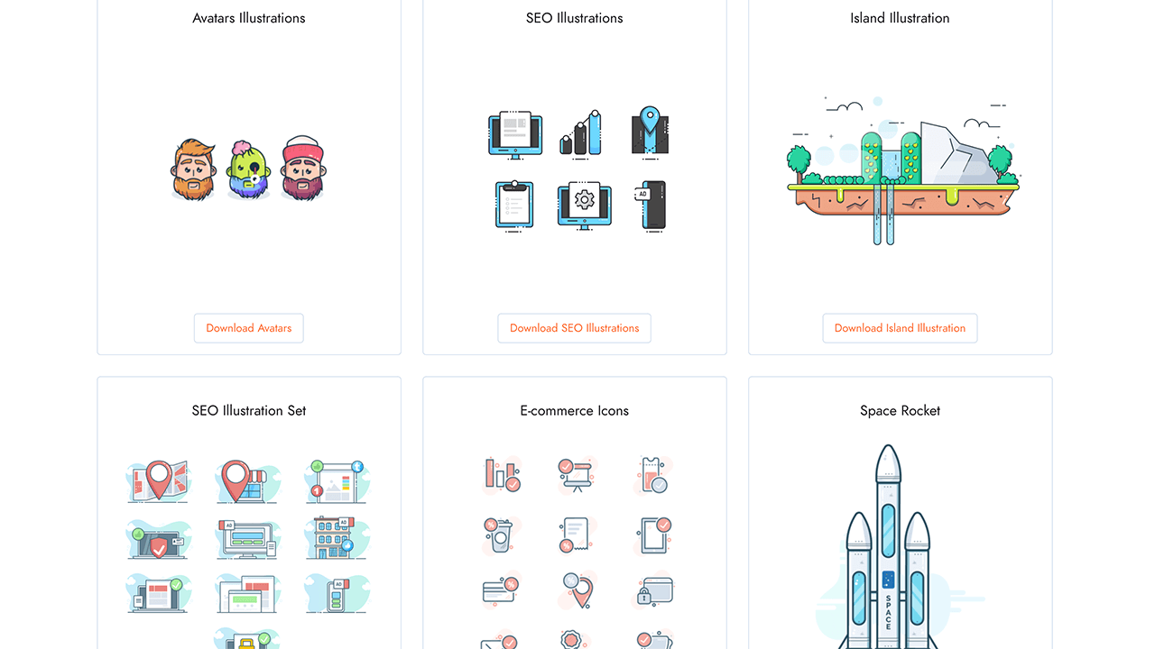 往下翻可以看到一些漂亮的头像、SEO等系列插画或图标。