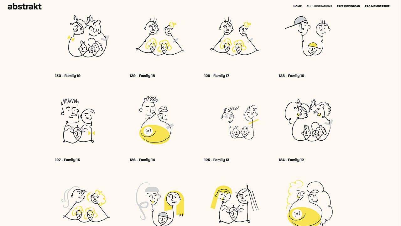 往下翻即可看到网站上提供的抽象插画,有的插画素材提供了对应的名称,比如这个家庭的抽象插画。