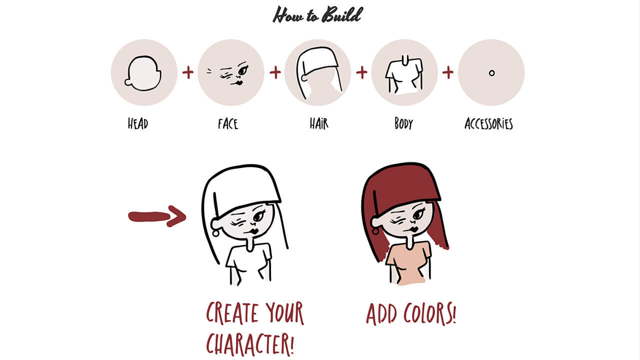 这些手绘草图如何创建,这里分解解释了主要由头部、脸部、头发、身体等部分组成,可以创建黑白和彩色人物插画。