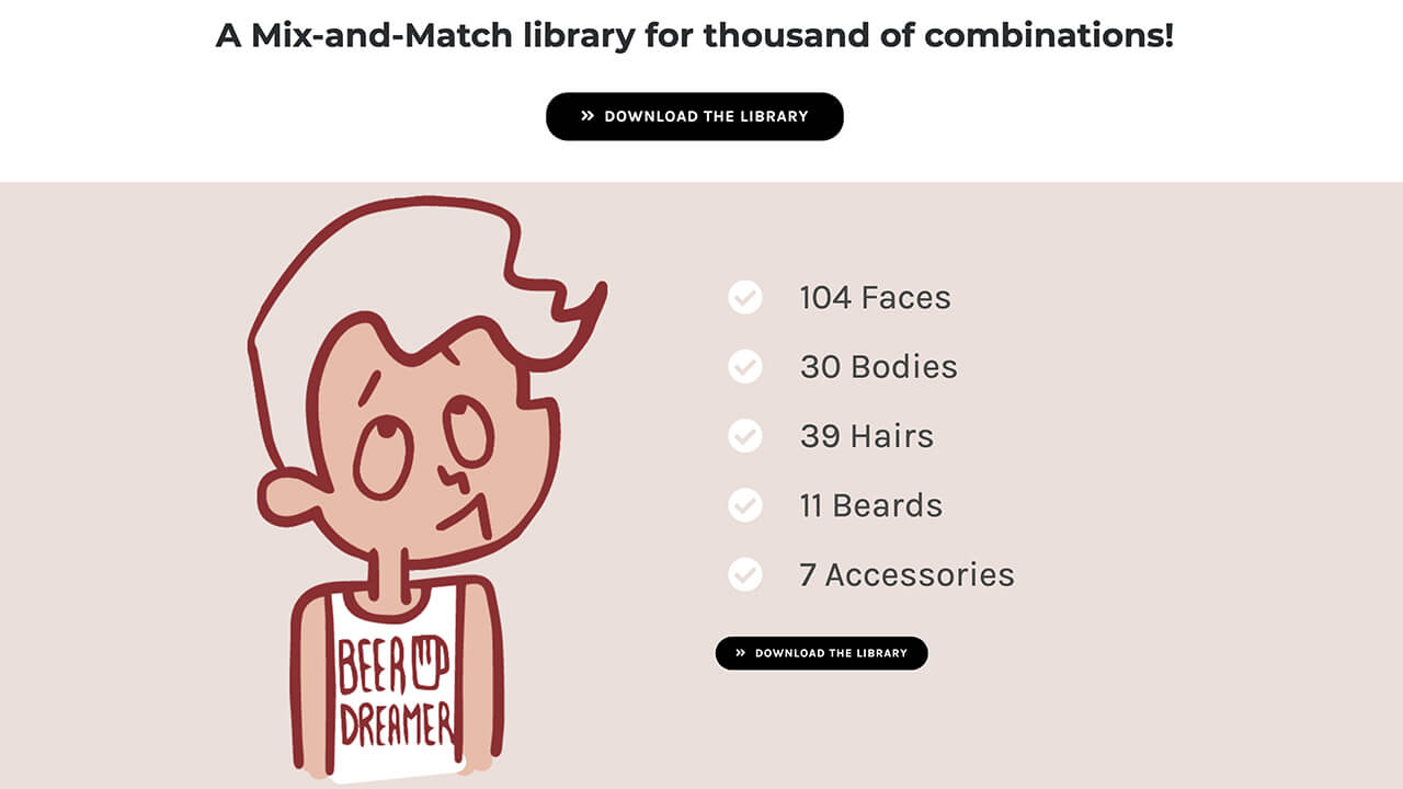 最后,这个手绘资源库提供了104张面孔、30个身体、39根头发、11个胡须、7个配件,可以直接点击DOWNLOAD THE LIBRARY免费下载。
