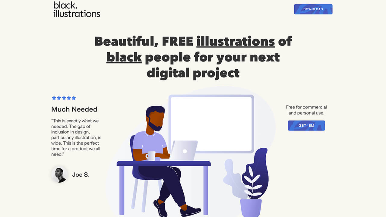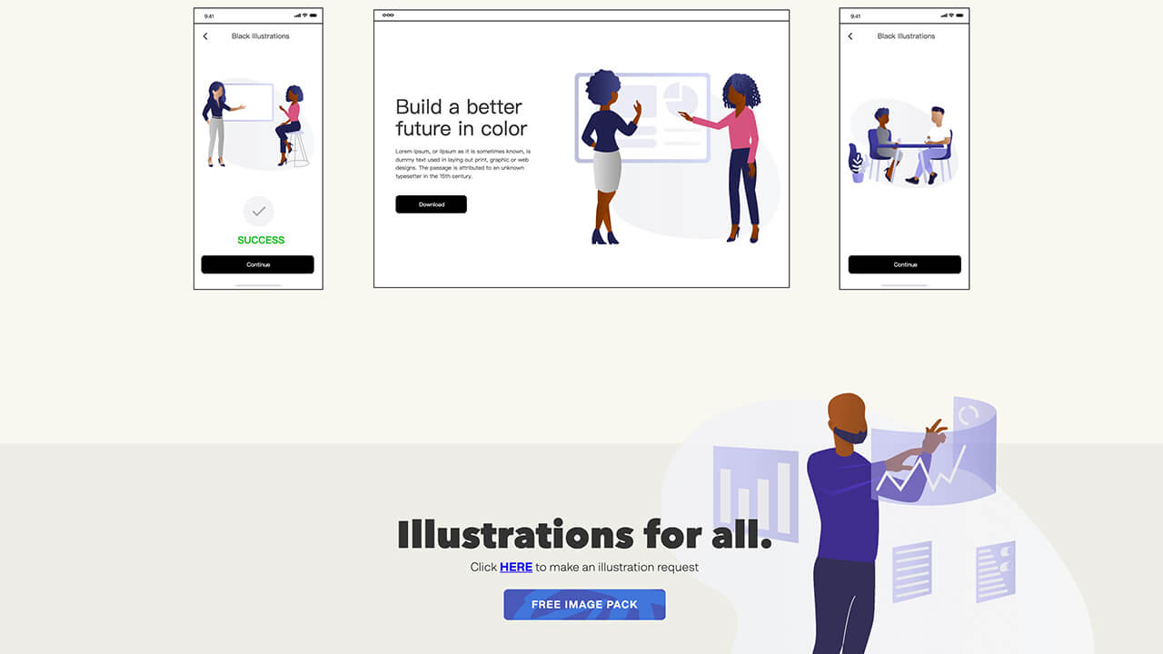 它是一个一个免费可商用的黑肤色插画素材,网站上有超过40种不同插画图案,主要分为办公室和日常生活、医疗专业人员两大类别,所有插画素材提供了PNG、JPG、AI、SVG、Sketch等格式。