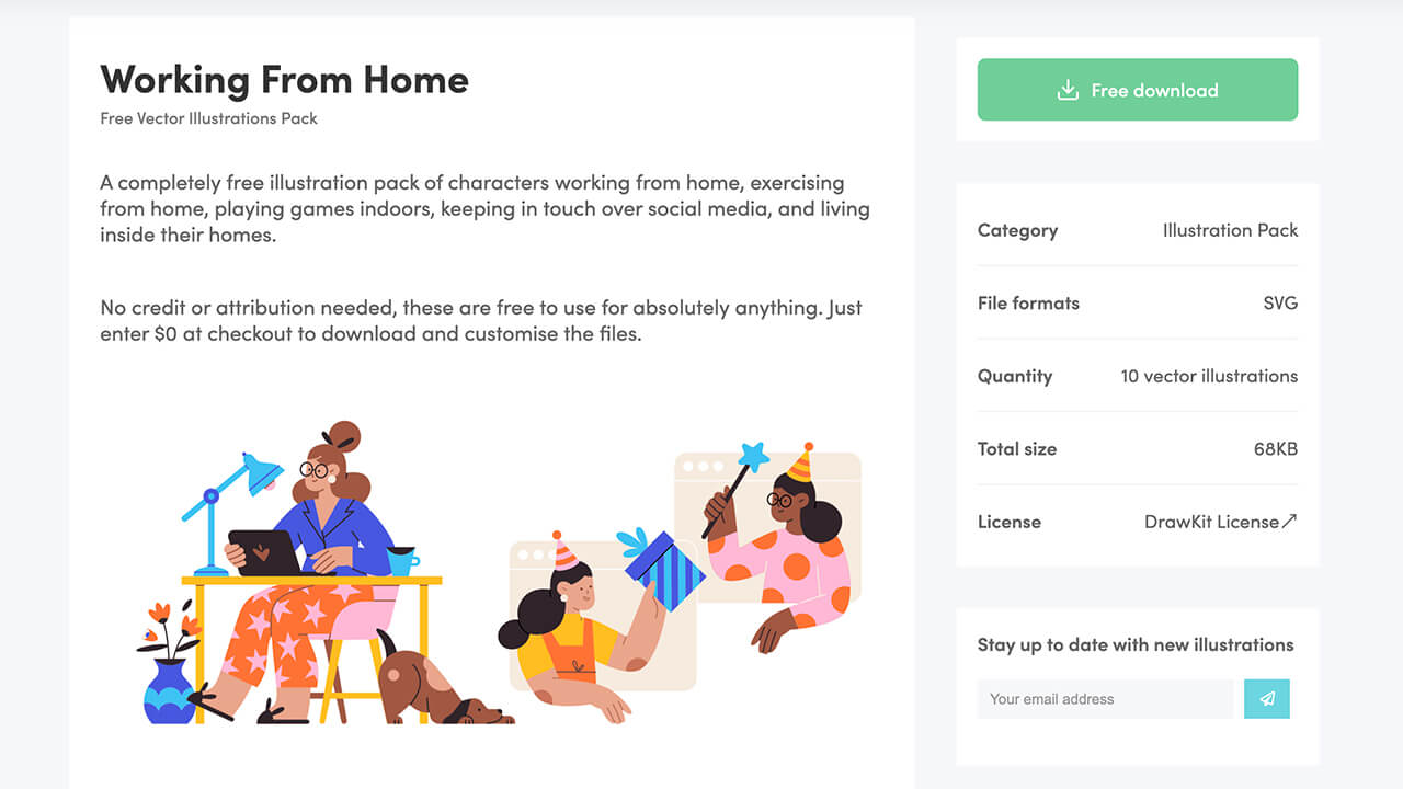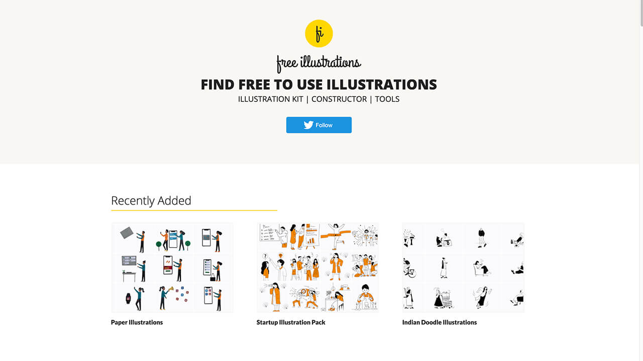 打开网站,可以看到大标题就是查找免费可商用的插画图,一目了然可以看到最近添加或更新的插画素材,有的是插画包,有的则是一组插画。