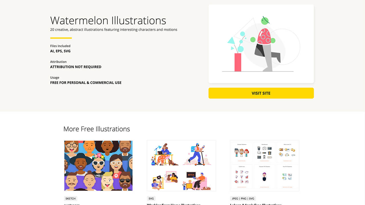 点击任意一个插画素材,进入到详情页,左侧介绍了此插画素材的文件格式、插画主题以及免费可商用的一些标注,同时下面也提供了更多其它的免费插画。