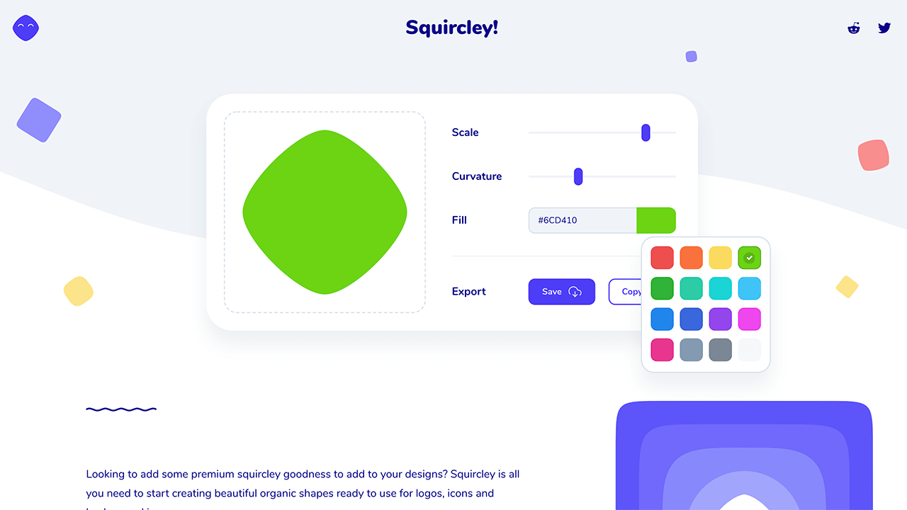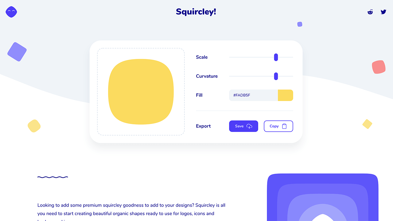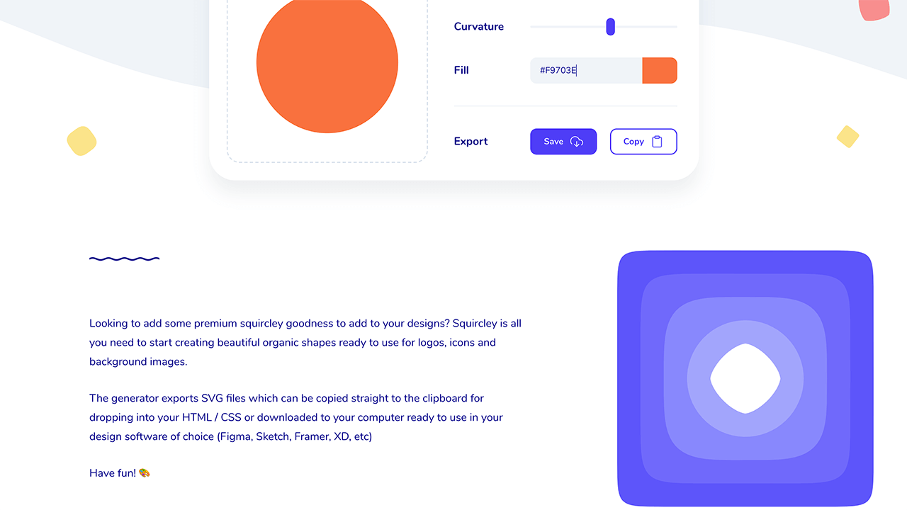 调整出一个满意的形状,点击Save或者Copy即可直接下载或拷贝SVG代码,它可以为你的设计增加一些美感,这些形状可用于Logo、图标、背景图像等场景。