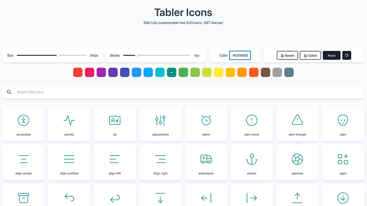 打开网站可以看到558个完全可定制的免费SVG图标,默认是黑色的图标库,它提供了搜索、修改颜色、大小、图标粗细的入口。
