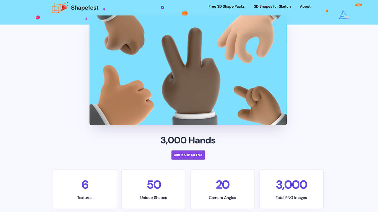 打开网站,可以看到大标题3000个免费的手势库,它有6个贴图、50个独特的形状、20个相机角度、3000个PNG图片。