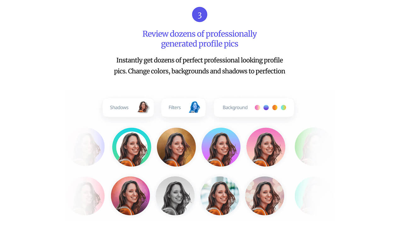 立即获得数十个完美的专业头像照片,生成的图片可以编辑颜色、阴影等设置。