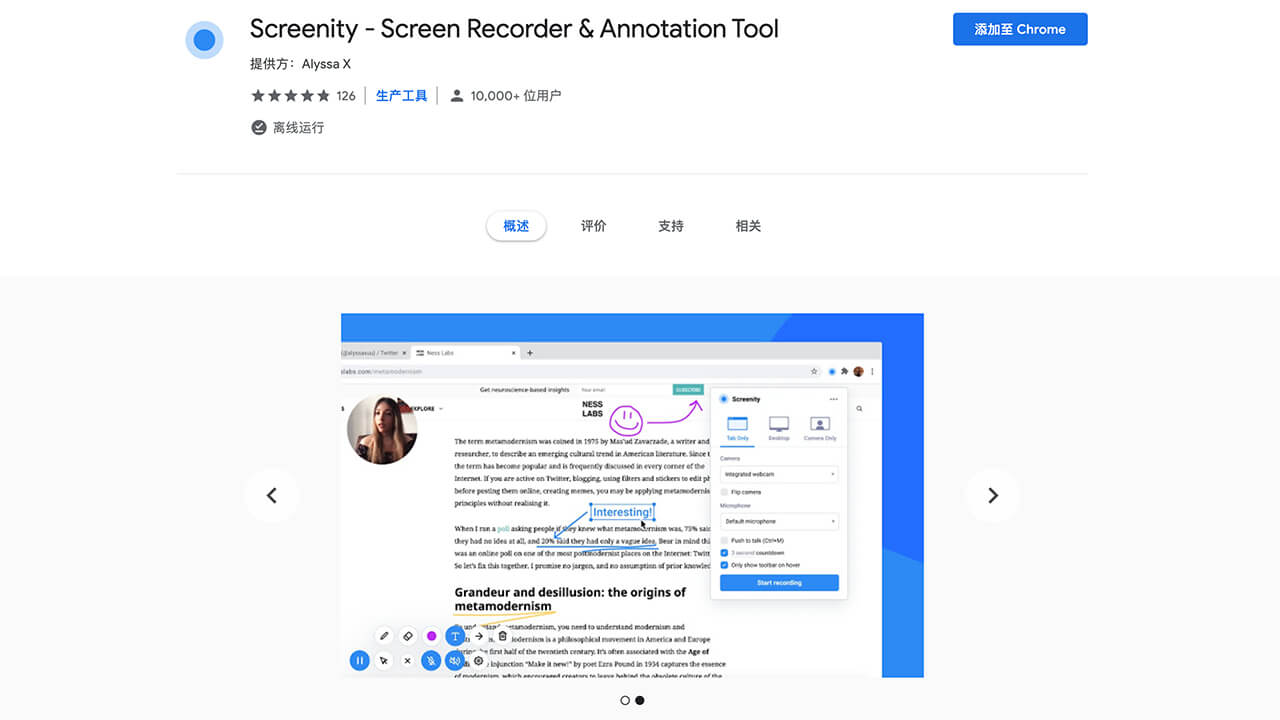 网址:https://chrome.google.com/webstore/detail/screenity-screen-recorder/kbbdabhdfibnancpjfhlkhafgdilcnji