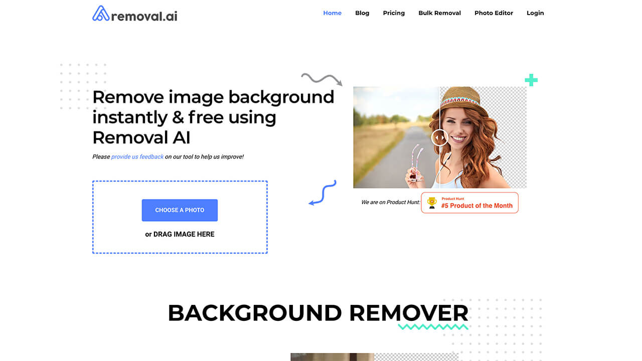 打开网站,使用Removal.ai立即免费删除图像背景,它曾是ProductHunt上当月排名第五的产品。