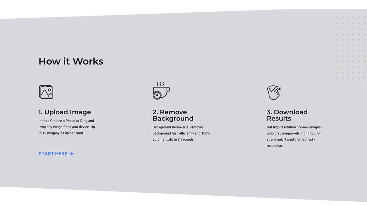它是如何工作的,第一步:上传图片,图片限制大小12M,第二步:使用AI技术3秒钟内快速去除背景,第三步:下载高分辨率的预览图像