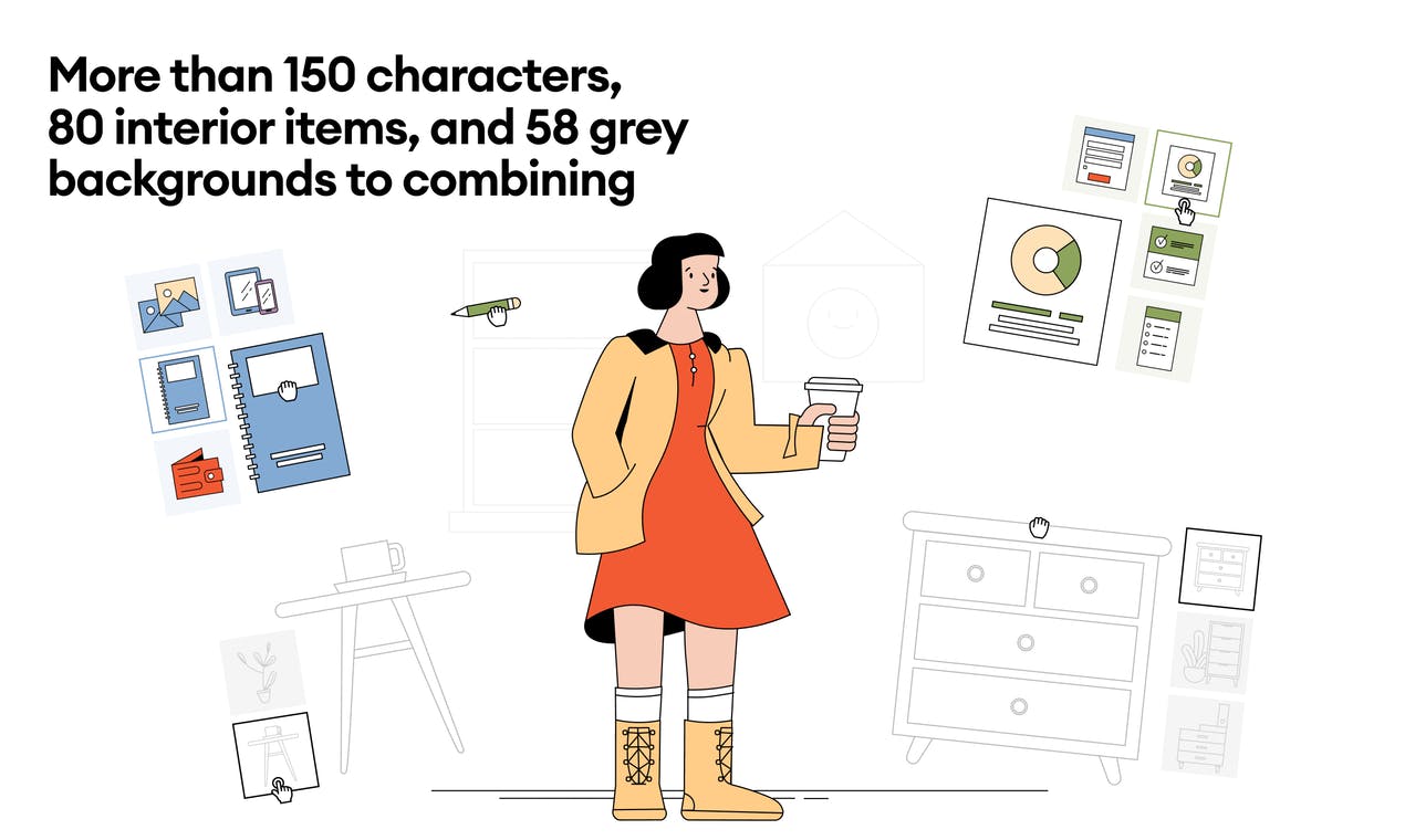 它是一个很大的矢量形状集合,Manufactory Constructor由150多个字符、80个内部元素和58个灰色背景组成。