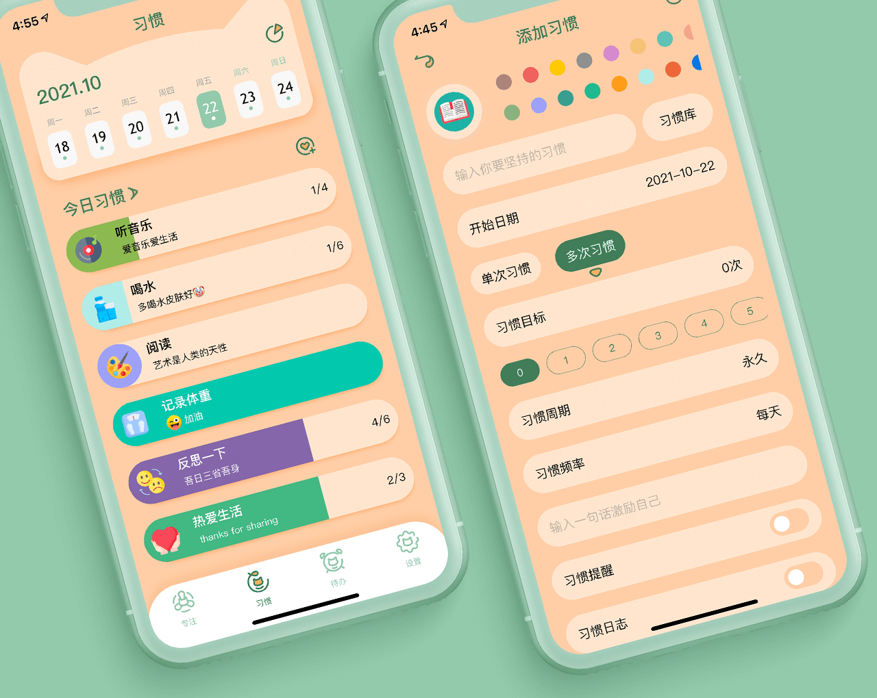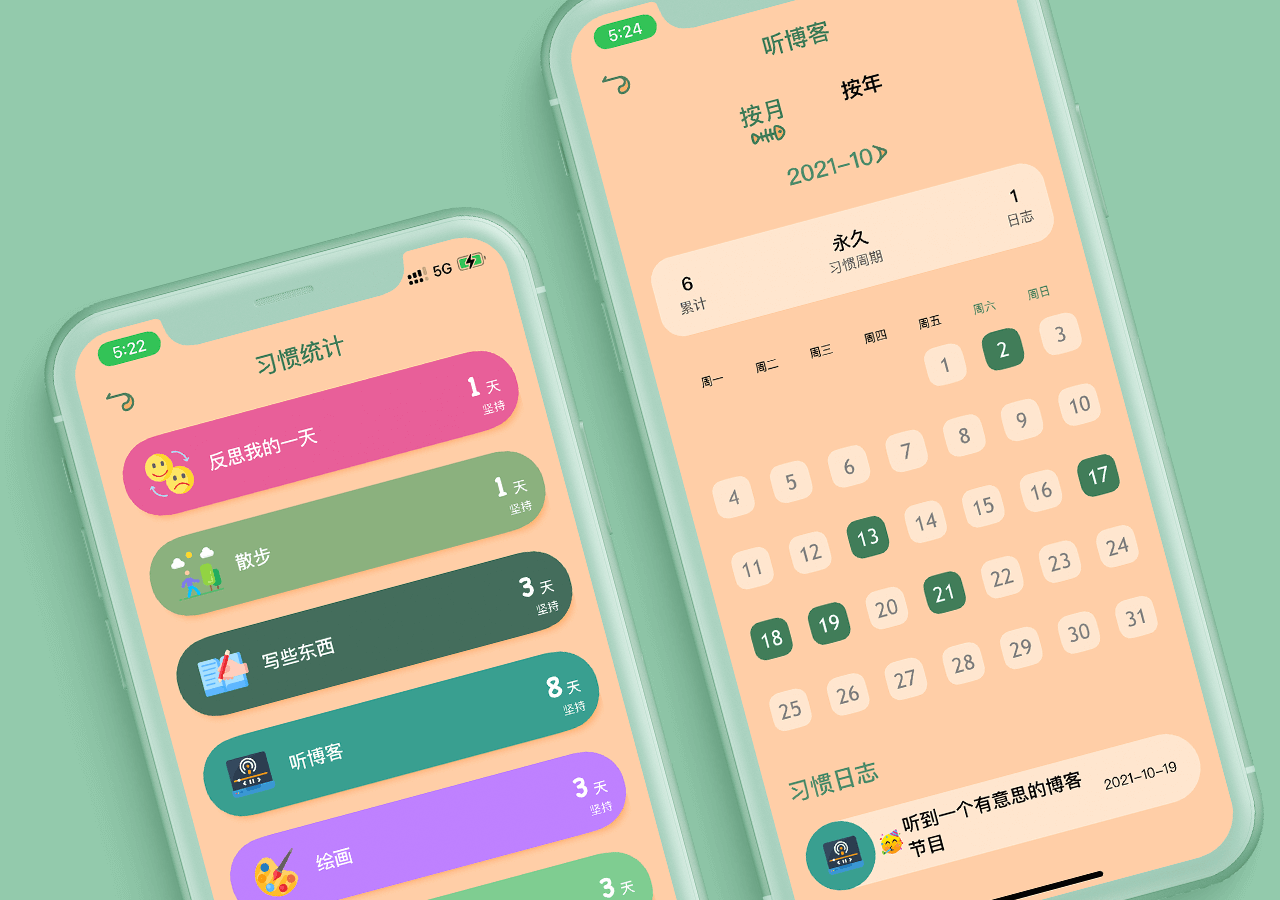 习惯目标:习惯目标支持多次打卡,比如:创建一个喝水的习惯,每天5杯水,可以打卡5次,通过多次目标习惯更有效的帮助我们养成好习惯。