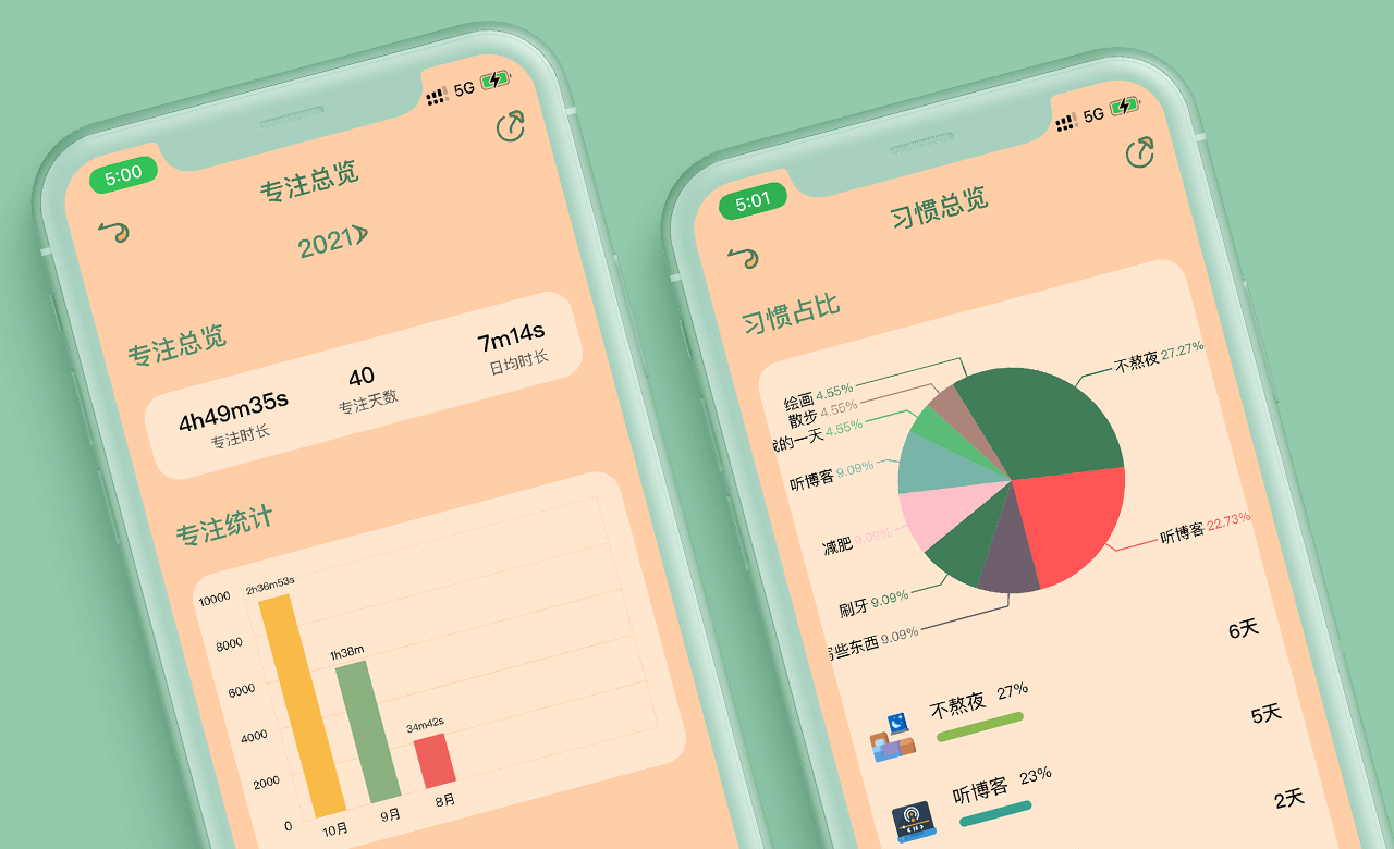 专注/习惯统计:更完善的统计视图,按月、按年,柱状图、饼状图一目了然查看专注时间以及习惯数据。